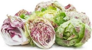 Radicchio: In the winter months, chicories are a delicious alternative to lettuces. Delectable raw or cooked—each variety offers their own unique taste and texture that elevate both salads and savory dishes. Chioggia and Treviso are known for their vibrant dark crimson leaves. Their bitter flavor mellows, and actually becomes sweet when grilled or roasted. Castelfranco (right) has pale tender green leaves with specks and splotches of burgundy—truly beautiful and very mild tasting! Rosa is a stunning pink variety with soft, elegant bitterness and delicate, tender leaves. Look for these leafy greens under “Greens Radicchio” on our list!